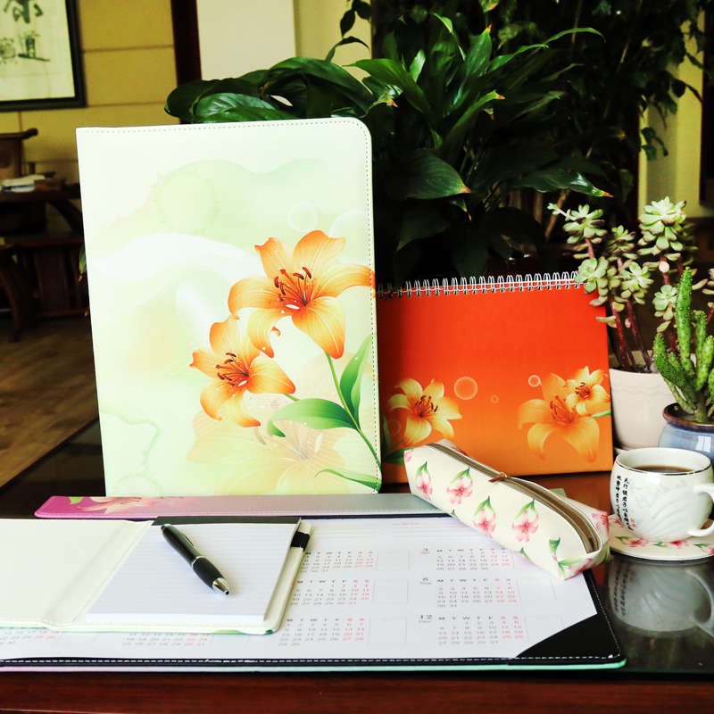 封面白色PU彩色印刷,1.5mm灰板,有海绵,四周踩线,圆背圆角内芯:142*205mm,70g120张象牙白纸1色印刷,有丝带和笃头布,圆角