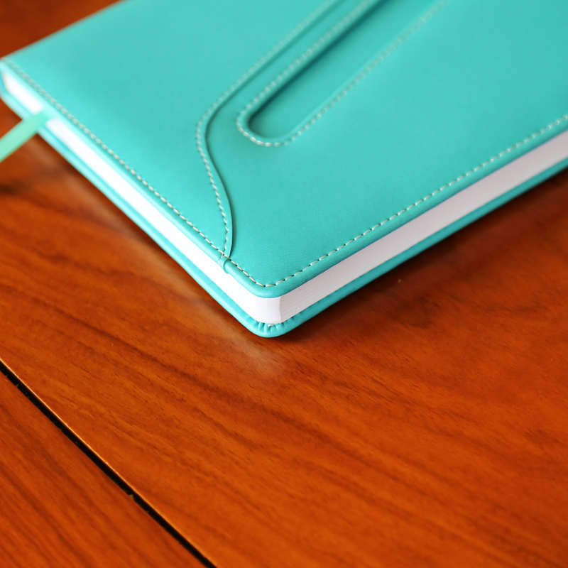 封面普通PU材料,同料拼接,有模切笔插位,15mm松紧带笔插,1.5mm灰板,有海绵,四周踩线和面线,圆背圆角